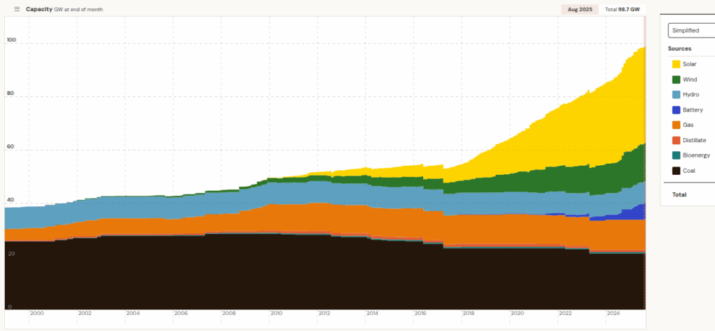 For the latest quarter (2025 Q3), the spread of generation categories across all the hours in the quarter is show below.