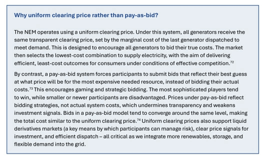 The wholesale electricity market is currently undergoing a broad review let by Tim Nelson. In its interim findings, the Nelson review very clearly finds that the fundamentals of the system are sound. There are no proposals to fundamentally change the market dispatch mechanism.