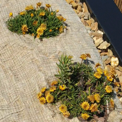 The modules covered only about half the roof area. The balance of the roof area was covered with a coarse mulch, and trimmed around the outside with river pebbles. Then the whole lot was covered with a sand-coloured jute matting, which serves to stop the mulch blowing away. A side effect of the use of the jute mat was to give the whole thing the appearance of a sand dune. This was a plus because it is visually in-keeping with the dune systems in the vicinity.