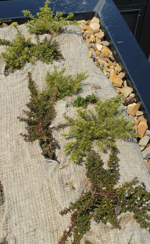 The plants are in a very exposed location, and the winds are severe. So things haven't grown much, if any, since they were put up in October. We'll need to keep a close eye over summer. The result is the apparent density of plants on the roof is less than we'd expected because of limited amount of spreading.