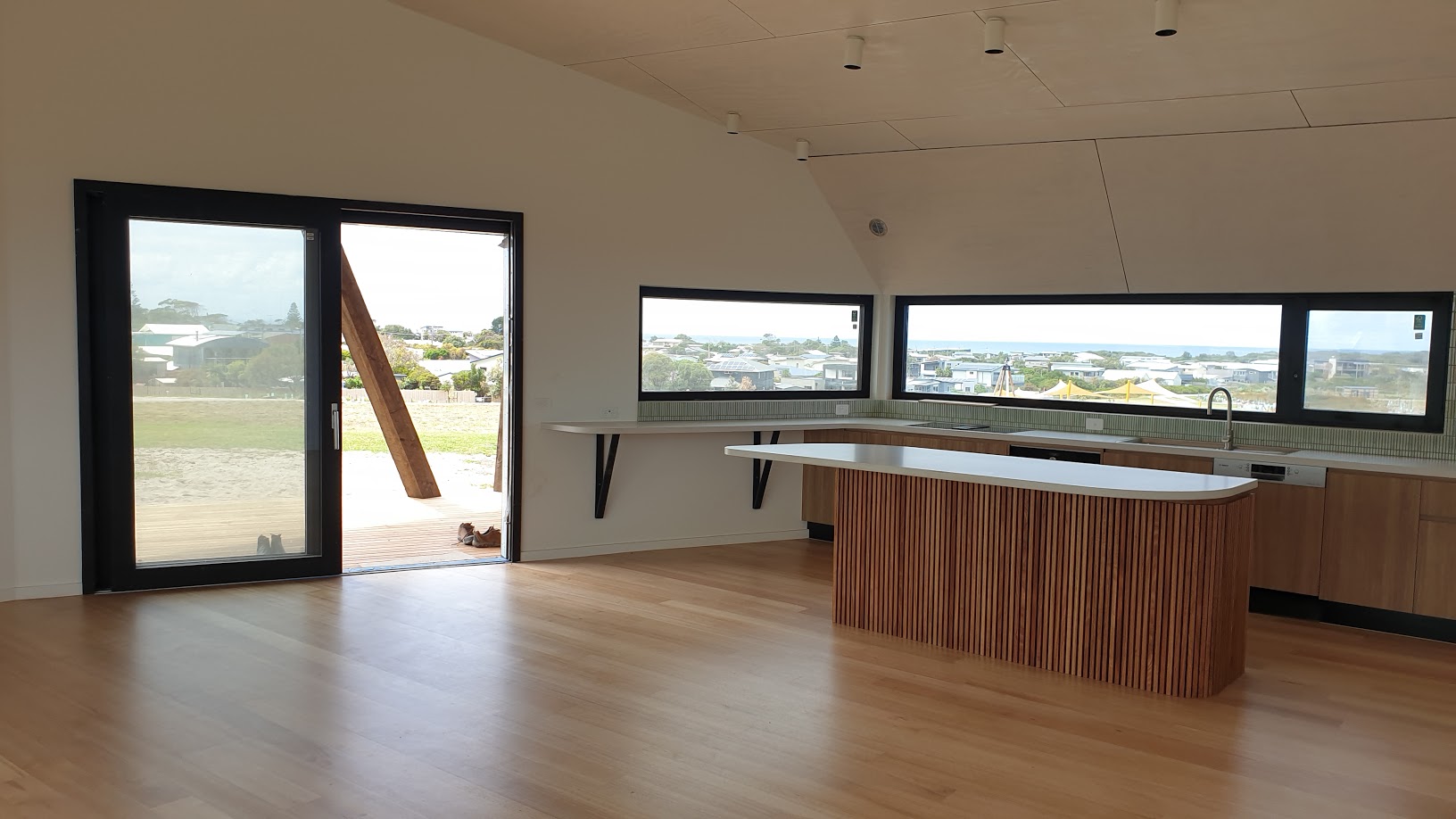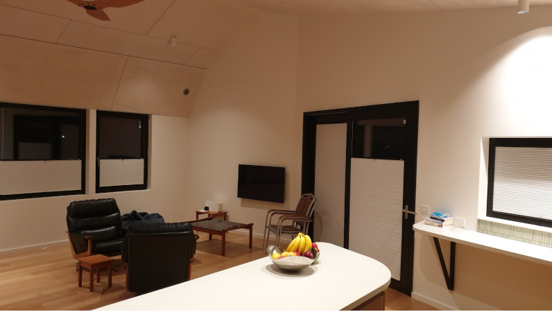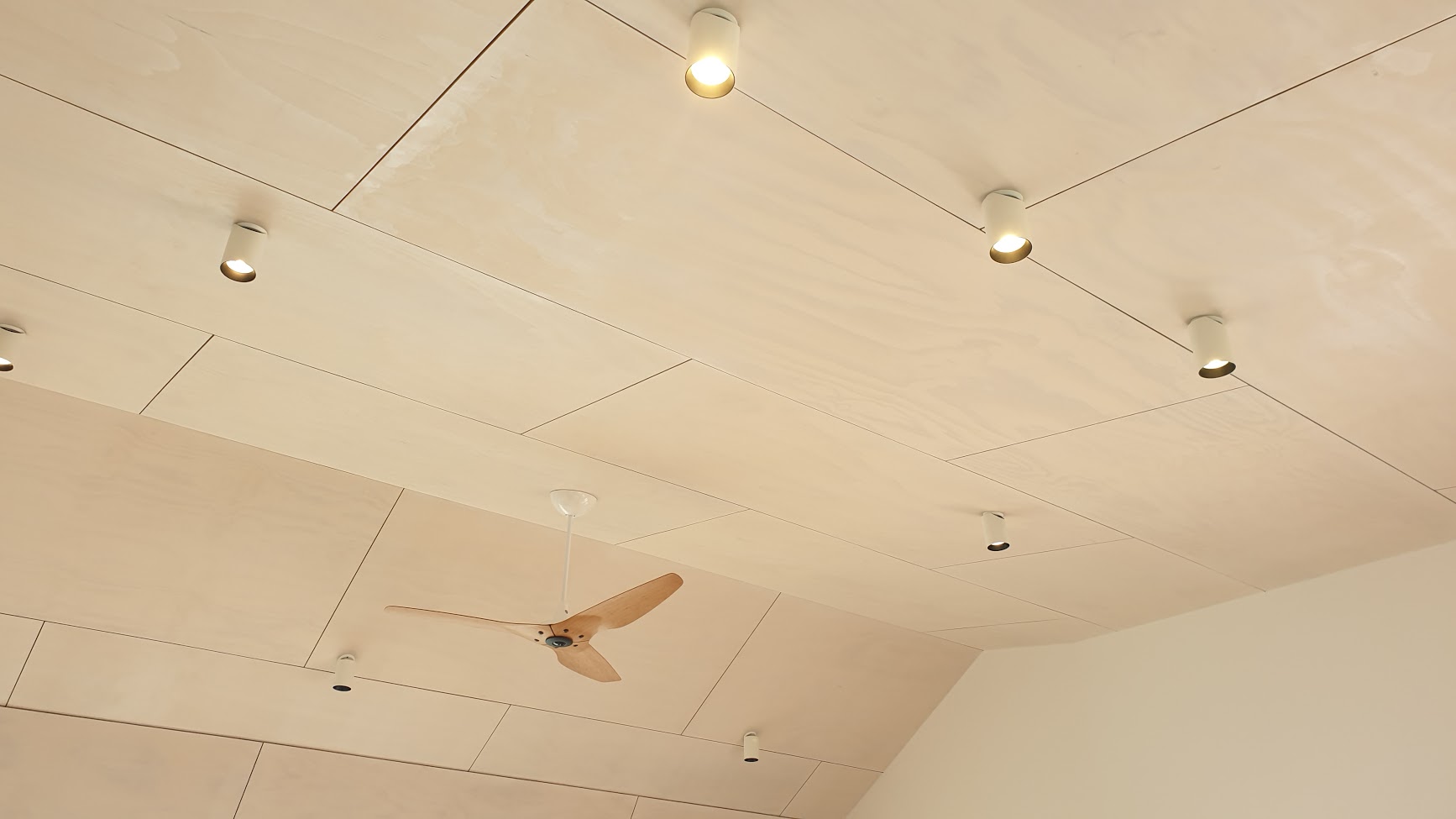 | Vaulted ceiling | The main living/kitchen area has a vaulted ceiling using ply sheets with expressed joints and subtle whitewash finish. |