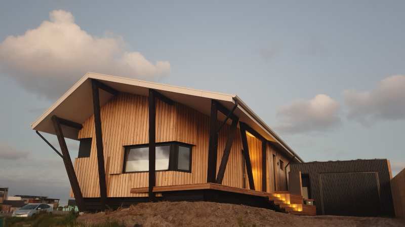| Cladding | Reverse board and batten with radial-sawn timber |