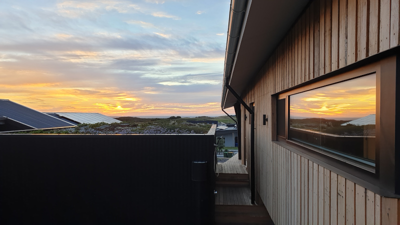 | Window frames / mechanism | Painted, finger-jointed pine frames with powder-coated aluminium face. Mix of 68mm and 88mm frame thickness. Mix of fixed windows, tilt-and-turn, sliding door, hinged doors. |