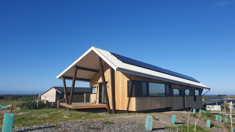 | Roof | Novel asymmetric gable with sloping ridge line. North: 34**°; South: 17**°. Supports excellent solar generation. Eave extensions on east and west provide generous shading. Exterior north wall fully shaded in summer by careful eave configuration. |