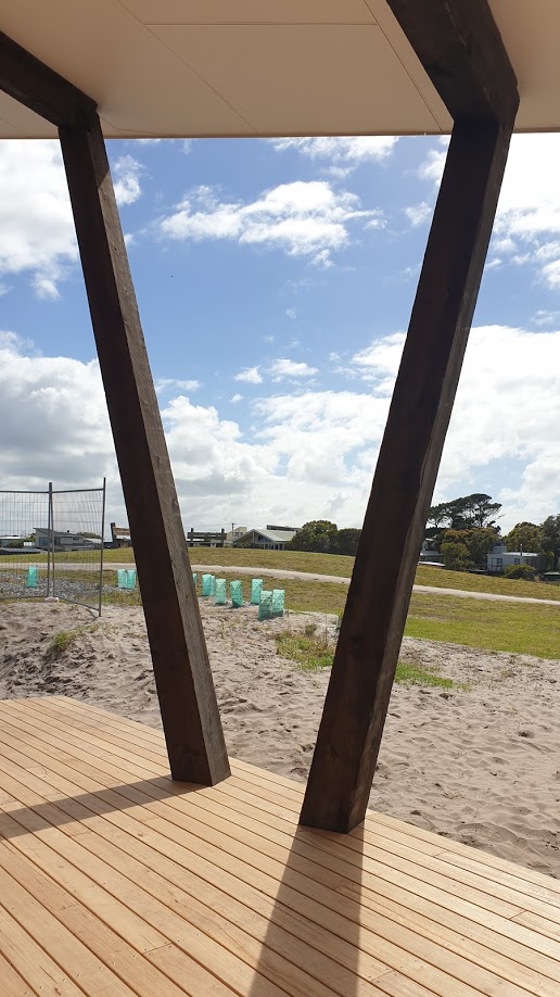 | Posts | 200mm Cypress posts hold down the eave extensions and provide a dramatic visual feature. |