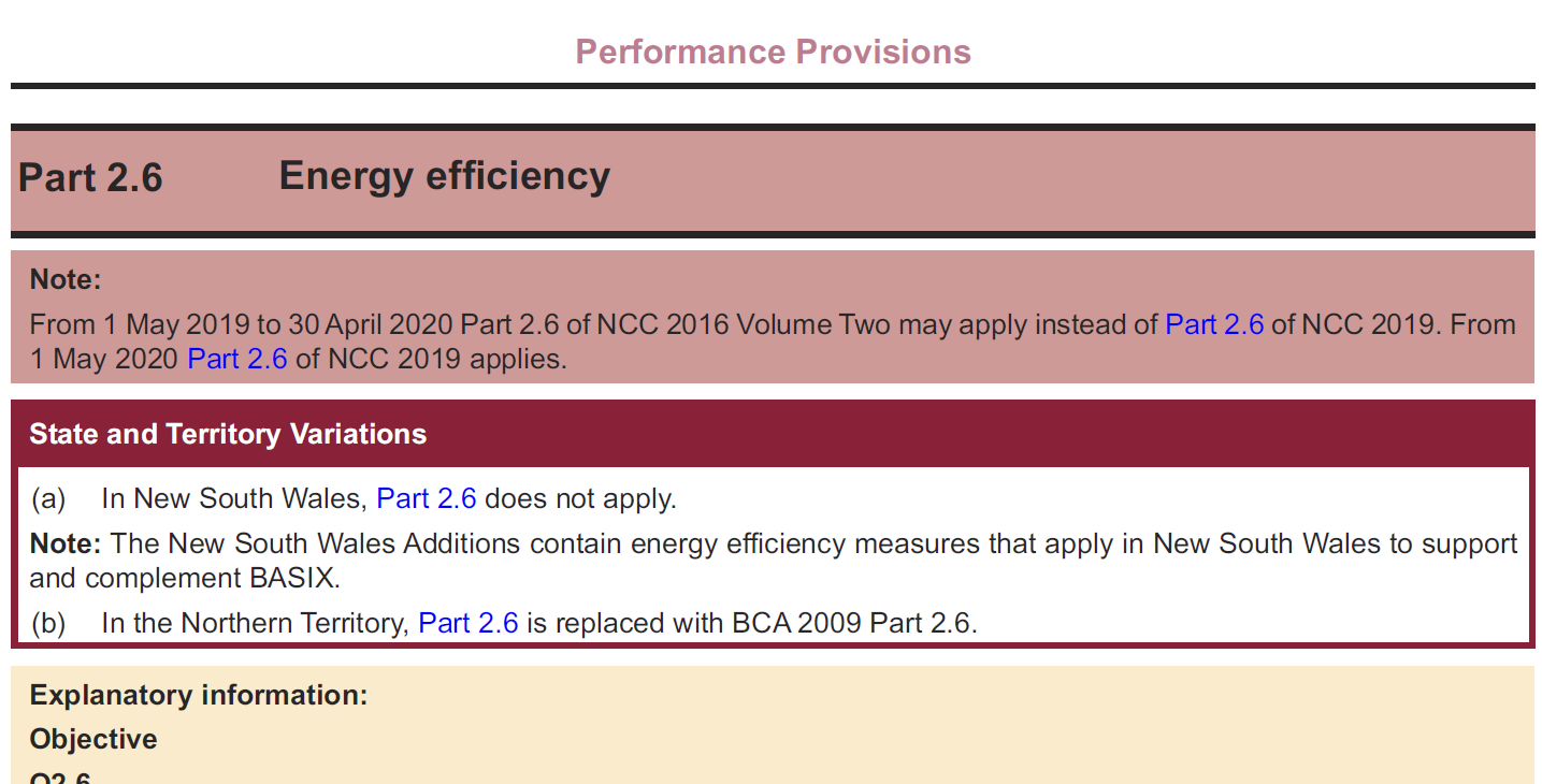 Another key reason why the six-star narrative is misleading is that in NSW - our most populous state - NatHERS star ratings don't apply at all. As the excerpt below shows, in NSW, a separate system called BASIX applies instead of Section 2.6 (Energy Efficiency) of the NCC. BASIX does have its own thermal performance requirements which do use the same energy rating software as NatHERS. However, the ten-star performance rating scale does not apply.